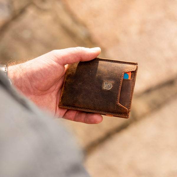 Das ist ganz einfach: Wir fertigen unsere Geldbeutel ausschließlich per Hand aus echtem vollnarbigen Büffelleder, welches als das robusteste Leder der Welt gilt. Zusätzlich versiegeln wir durch die besondere Schleiftechnik die Oberfläche der Geldbeutel. Während der Verwendung unserer Geldbeutel entsteht dadurch eine lebendige Patina die den individuellen Charakter dieses ausdrucksstarken Leders unterstreicht.