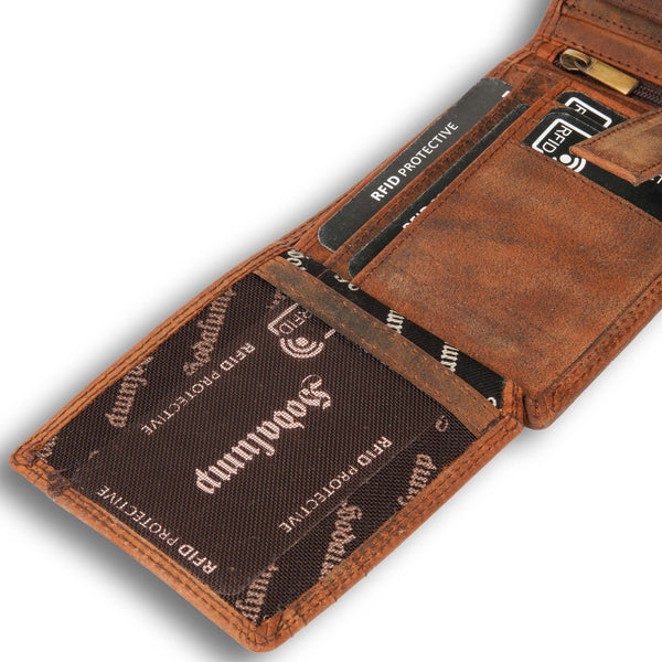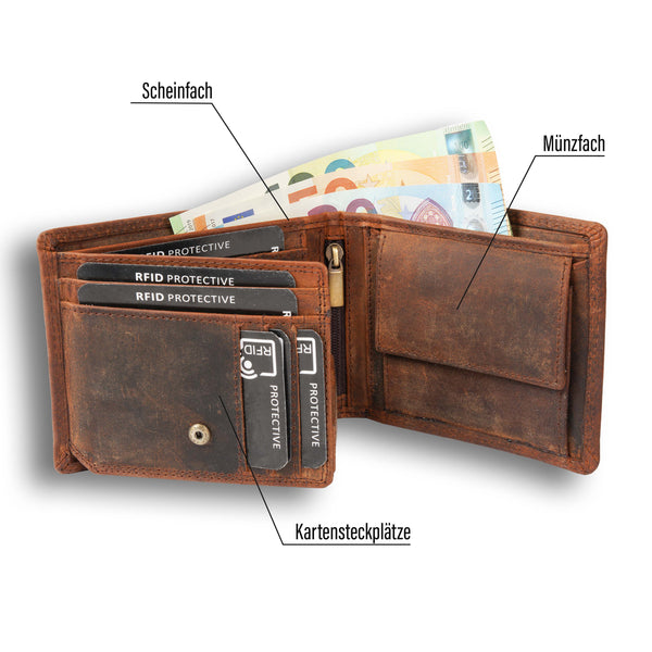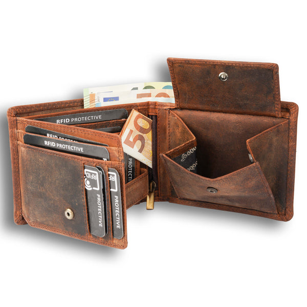 De Hodalump Classic portemonnee van bruin vintage echt leer is extreem duurzaam en robuust. Hij beschikt over een muntvak, 2 biljetvakken, 12 kaartvakken, een kijkvak en een ritsvak. De geïntegreerde RFID-bescherming zorgt voor extra veiligheid.