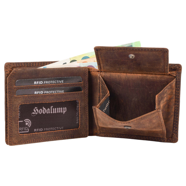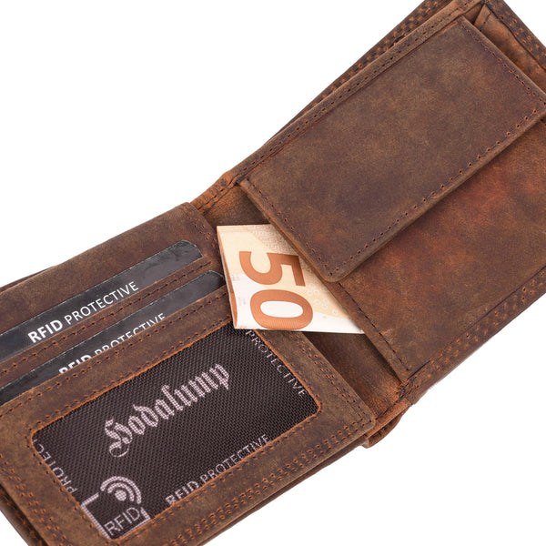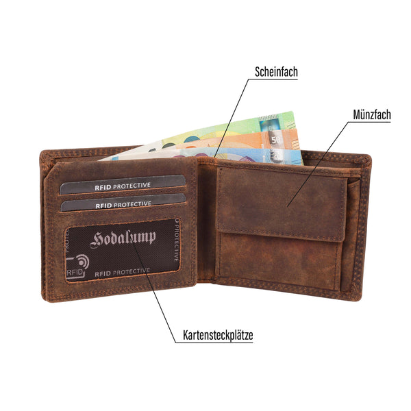 De Hodalump Classic portemonnee van bruin vintage echt leer is extreem duurzaam en robuust. Hij beschikt over een muntvak, 2 biljetvakken, 6 kaartvakken en een kijkvak. De geïntegreerde RFID-bescherming zorgt voor extra veiligheid.