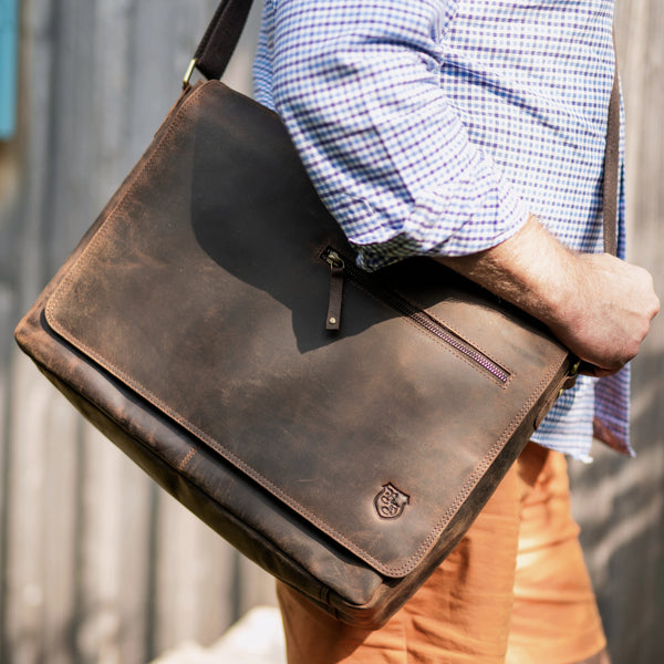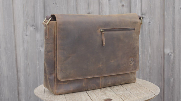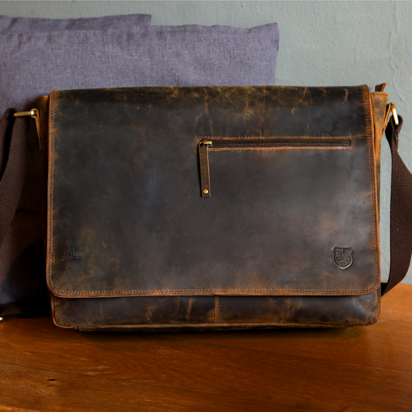 De herenschoudertas is gemaakt van aangenaam antislip vintage buffelleer. Het leer is natuurlijk, geolied (plantaardige olie) en geschuurd. Dit betekent dat de tas na verloop van tijd donkerder wordt en een mooie patina-look krijgt.