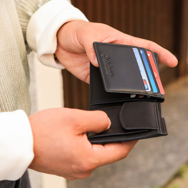 Die Hodalump Sim BLACK 2.0 ist der Inbegriff von Stil, Funktionalität und Qualität. Gefertigt aus hochwertigem Echtleder und in der exklusiven Black Edition, setzt sie neue Maßstäbe für Business-Geldbörsen. Die Steinbock Edition vereint alles, was du von einer eleganten Geldbörse erwartest – viel Platz für Karten, Scheine und Münzen bei gleichzeitig schlankem Design.