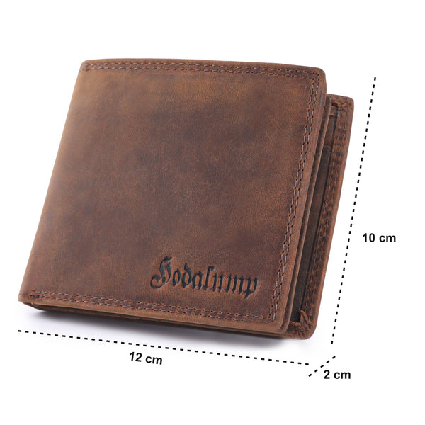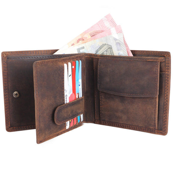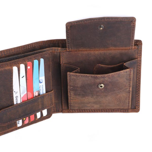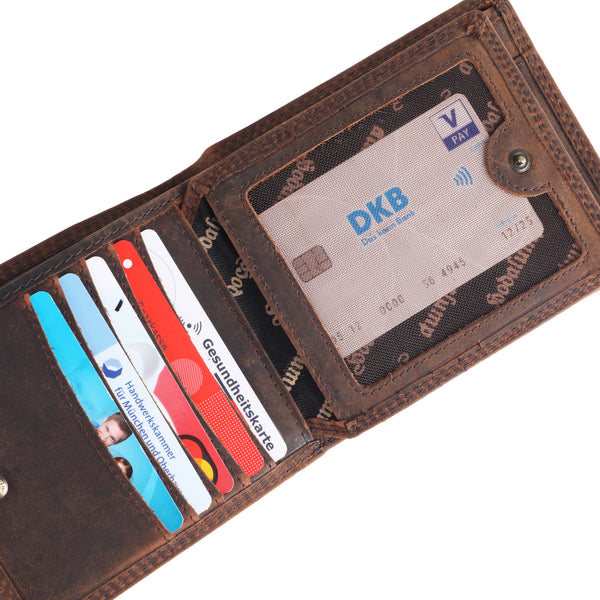 De Hodalump Classic portemonnee van bruin vintage echt leer is extreem duurzaam en robuust. Hij beschikt over een muntvak, 2 biljetvakken, 11 kaartvakken en een kijkvak. De geïntegreerde RFID-bescherming zorgt voor extra veiligheid.