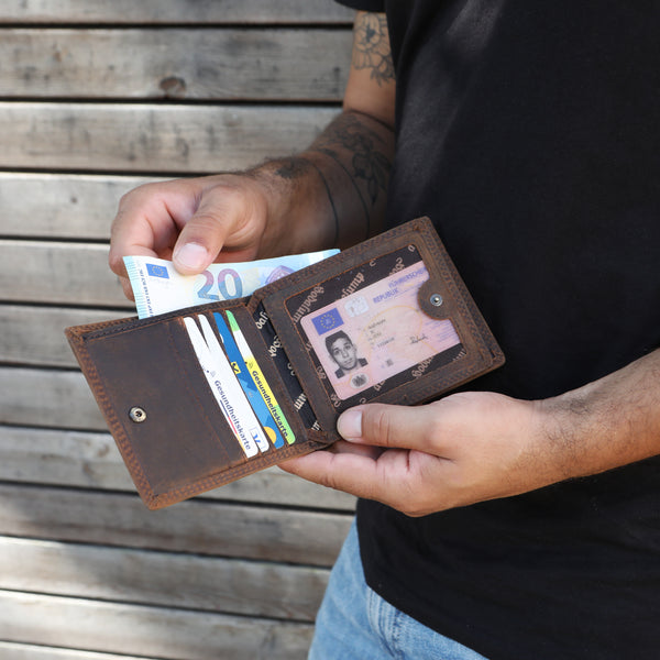 De portemonnee is gemaakt van aangenaam antislip vintage buffelleer. Het leer is natuurlijk, geolied (plantaardige olie) en geschuurd. Dit betekent dat de portemonnee na verloop van tijd donkerder wordt en een mooie patina-look krijgt.