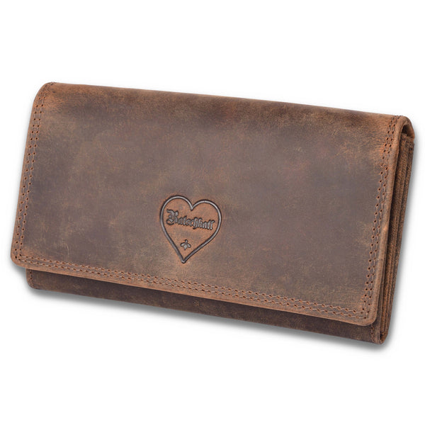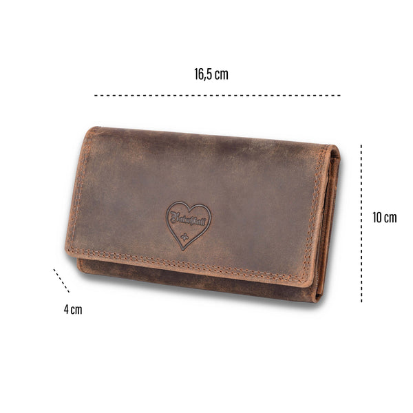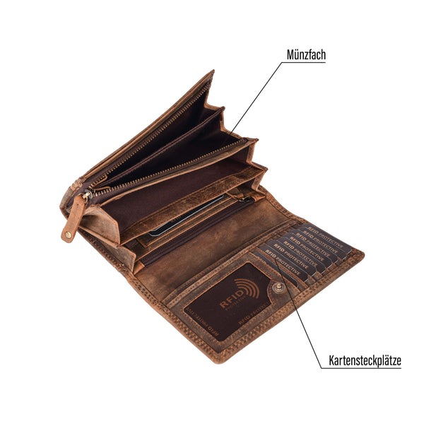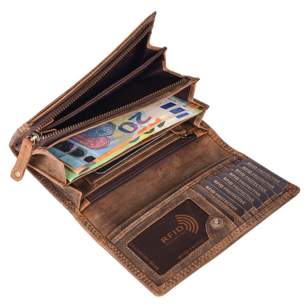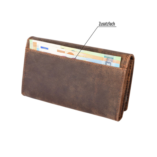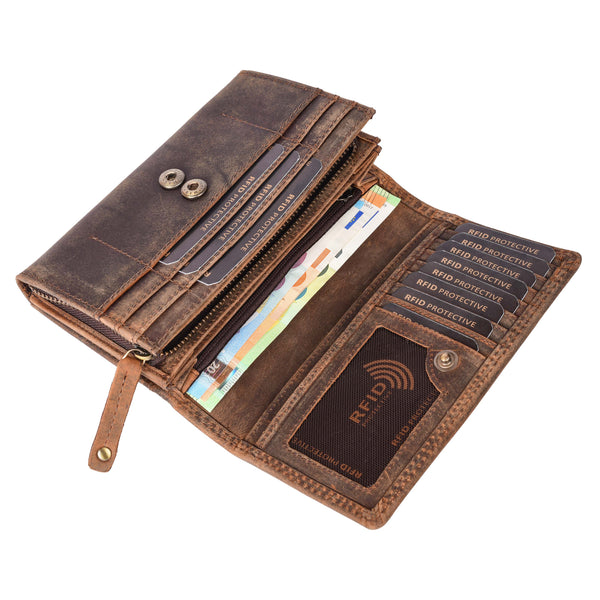 De portemonnee van bruin vintage echt leer is extreem duurzaam en robuust. De portemonnee heeft: 1 biljetvak, 1 muntvak en 14 kaartvakken aan de binnenkant. De geïntegreerde RFID-bescherming zorgt voor extra veiligheid.