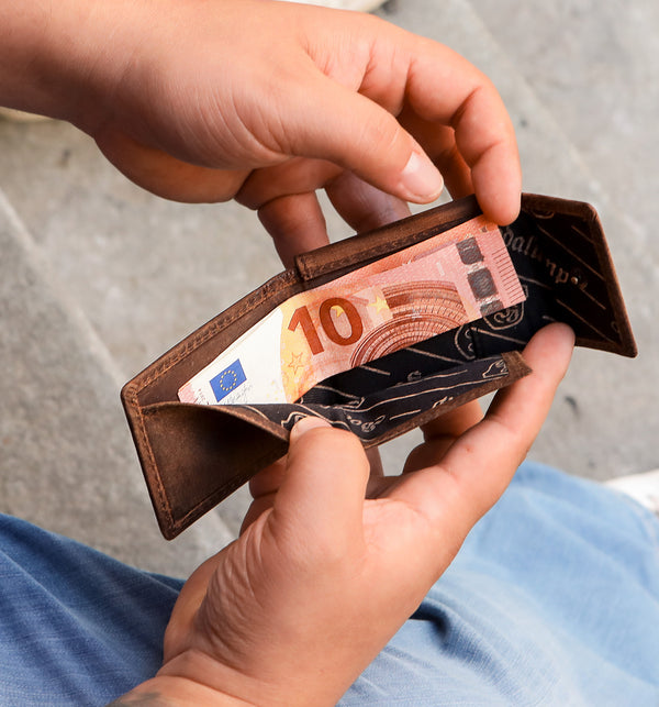 Das ist ganz einfach: Wir fertigen unsere Geldbeutel ausschließlich per Hand aus echtem vollnarbigen Büffelleder, welches als das robusteste Leder der Welt gilt. Zusätzlich versiegeln wir durch die besondere Schleiftechnik die Oberfläche der Geldbeutel. Während der Verwendung unserer Geldbeutel entsteht dadurch eine lebendige Patina die den individuellen Charakter dieses ausdrucksstarken Leders unterstreicht.