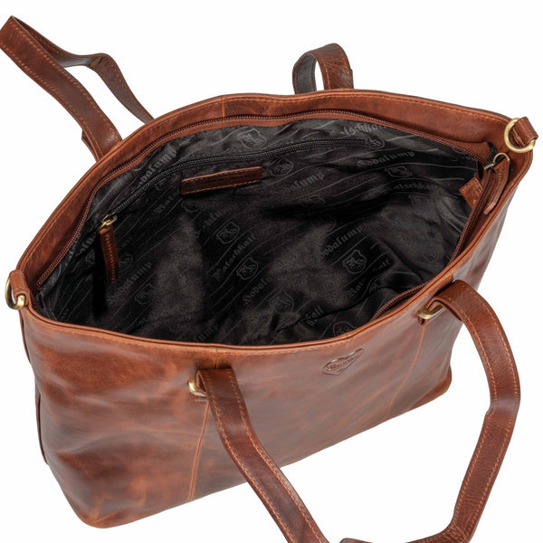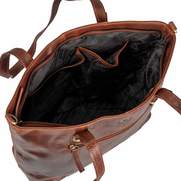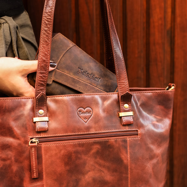 De shopper handtas voor dames is gemaakt van echt rood congac-leer en is extreem duurzaam en robuust. Dankzij de royale opbergruimte is deze tas de ideale metgezel voor al uw behoeften. Dankzij de intelligente indeling van de binnenkant kun je alles gemakkelijk opbergen, van je laptop en documenten tot persoonlijke spullen en kleine aankopen.