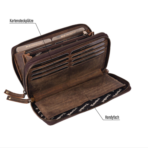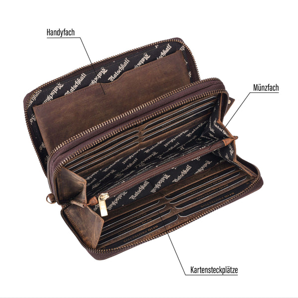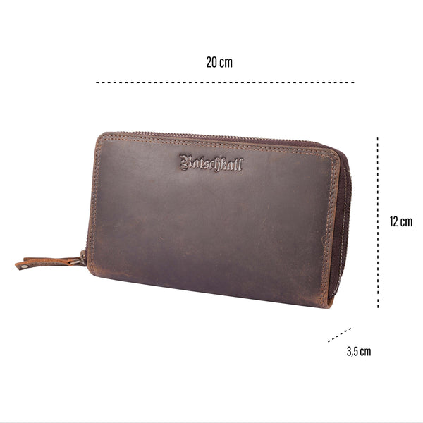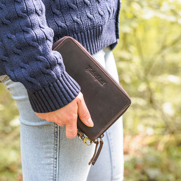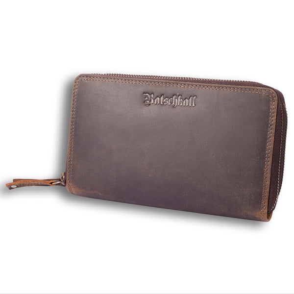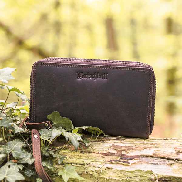 Im Inneren bietet sie Platz für alles, was du brauchst: zahlreiche Kartenfächer, große Fächer für Geldscheine, ein sicheres Münzfach mit Reißverschluss sowie ein zusätzliches Fach für Belege oder dein Smartphone. Dank des umlaufenden Reißverschlusses bleibt alles zuverlässig an seinem Platz – selbst wenn’s mal hektisch wird. Das geschmeidige Leder liegt angenehm in der Hand und entwickelt mit der Zeit eine einzigartige Patina.