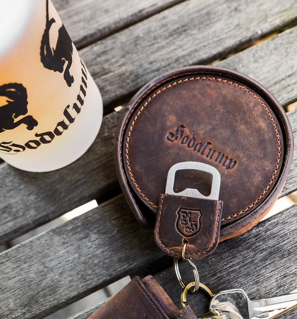 Crafted from sturdy genuine leather, each piece in the set exudes the typical Hodalump character: rustic, down-to-earth, and with a wink. The bottle opener fits comfortably in the hand and is a real eye-catcher at any local bar, while the keychain adds a stylish touch to your keychain – without any unnecessary frills.