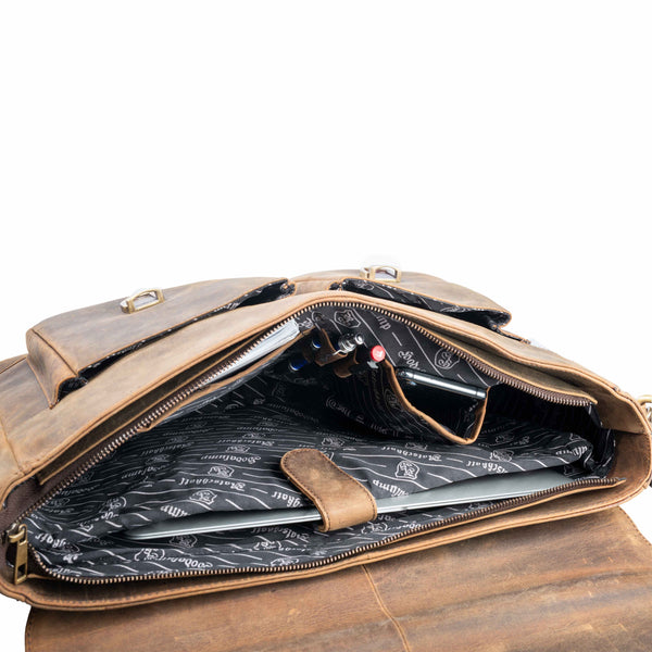 With a well-thought-out interior layout, a padded laptop compartment, several slip and zippered pockets, and a spacious main compartment, everything stays organized and quickly accessible. Two large front compartments and an additional back pocket round out the organization system. The removable, adjustable shoulder strap and sturdy leather handles ensure comfortable transport – even during longer workdays.