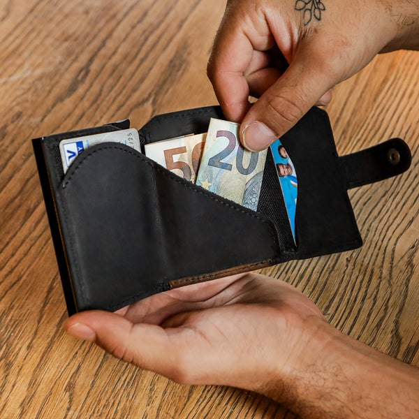 9 cards and banknotes of any size fit in the wallet