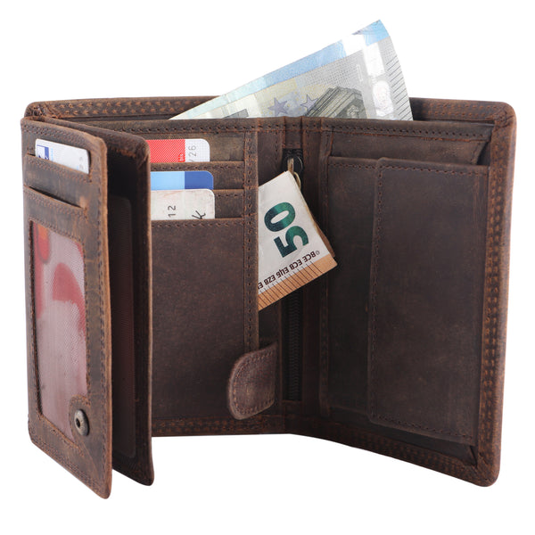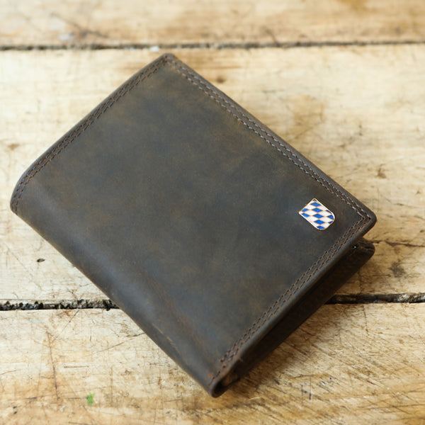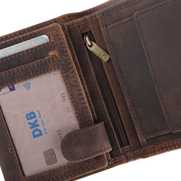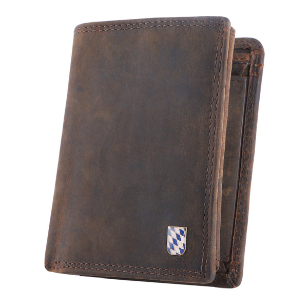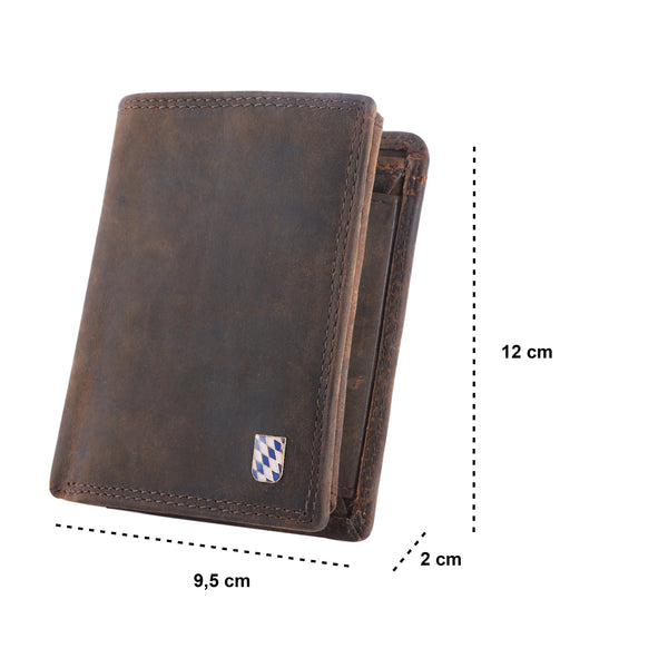 De Bayern portemonnee van bruin vintage echt leer is extreem duurzaam en robuust.2 compartimenten voor bankbiljetten, 7 compartimenten voor creditcards, 3 kijkvensters, 2 steekvakken, 1 compartiment met ritssluiting.. De geïntegreerde RFID-bescherming zorgt voor extra veiligheid.