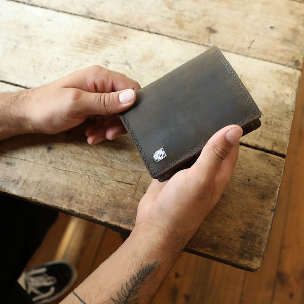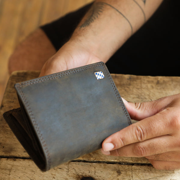 Das ist ganz einfach: Wir fertigen unsere Geldbeutel ausschließlich per Hand aus echtem vollnarbigen Büffelleder, welches als das robusteste Leder der Welt gilt. Zusätzlich versiegeln wir durch die besondere Schleiftechnik die Oberfläche der Geldbeutel. Während der Verwendung unserer Geldbeutel entsteht dadurch eine lebendige Patina die den individuellen Charakter dieses ausdrucksstarken Leders unterstreicht.