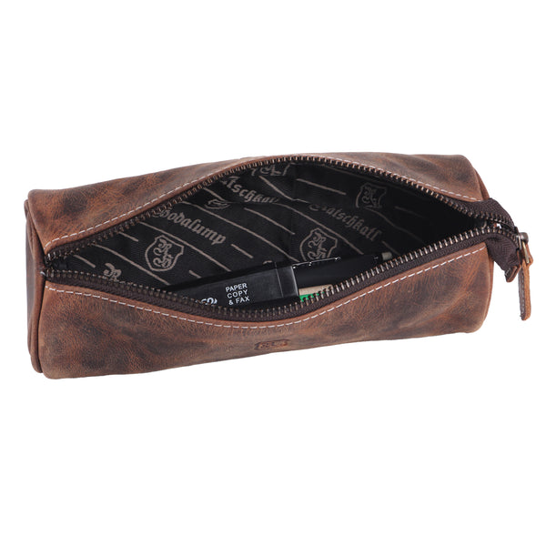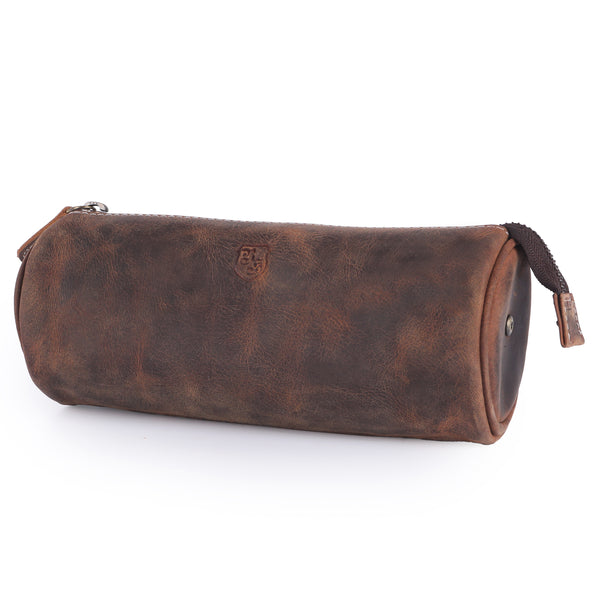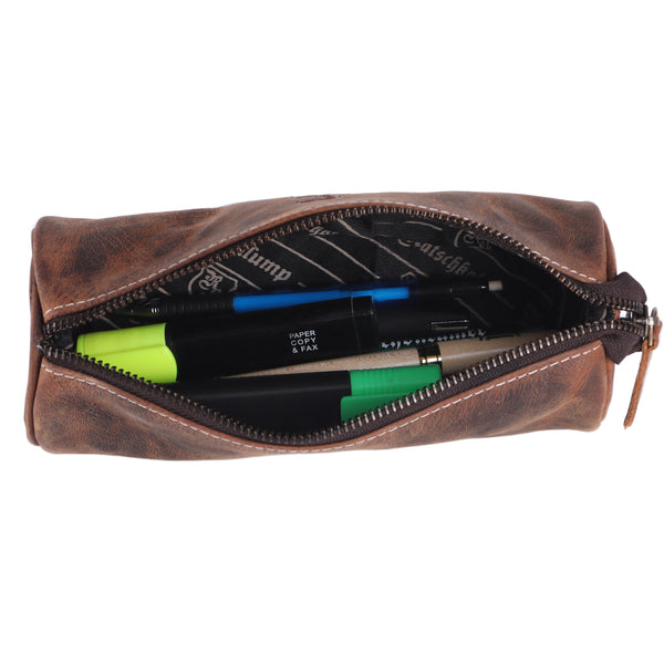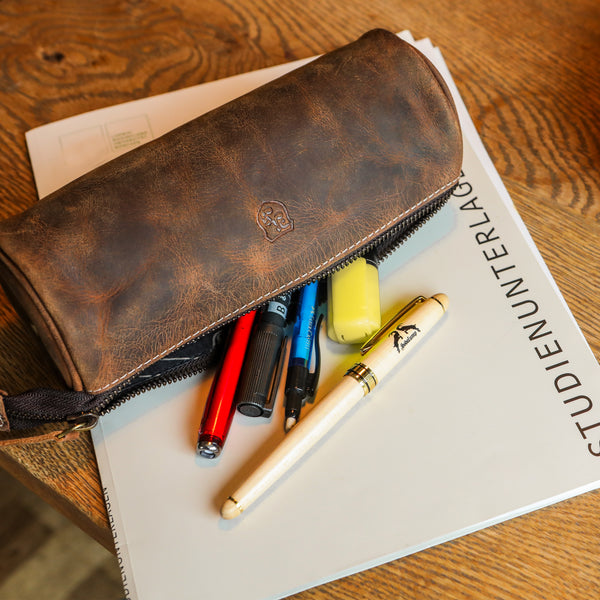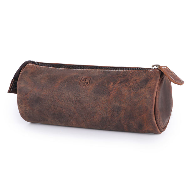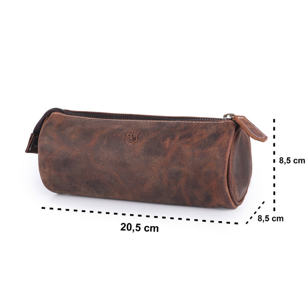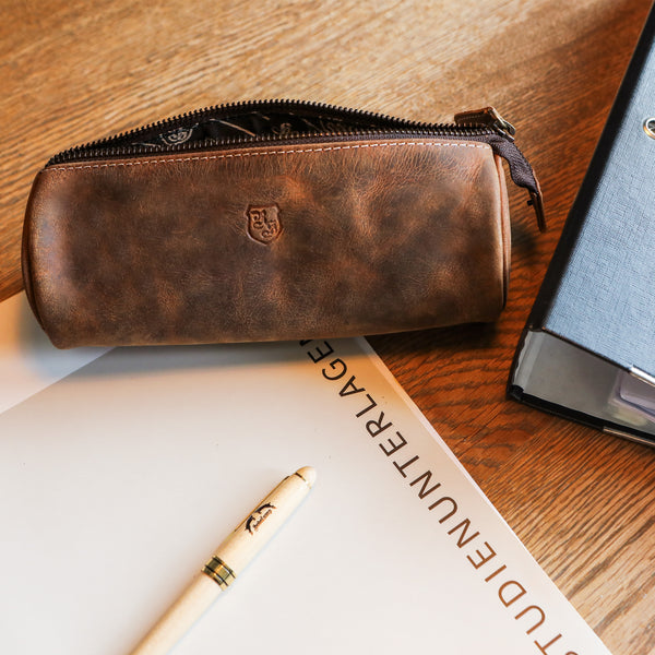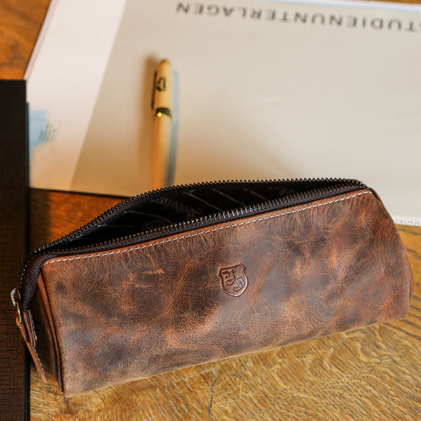 De etui van bruin vintage echt leer is extreem duurzaam en robuust. Het heeft een groot vak en een ritssluiting.